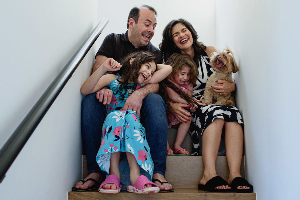 Anapaula e Pedro. Suas meninas arco-íris, Alice e Aurora, e a filha canina, Sonequita.